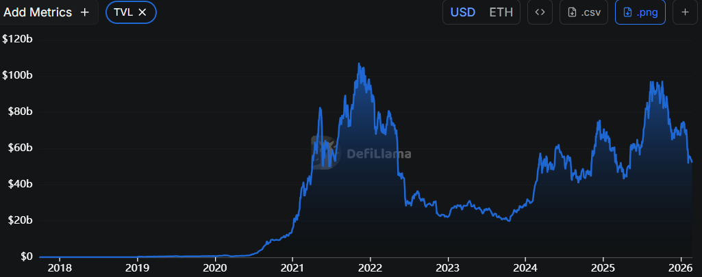 Onchain analytics paint a troubling picture. The total value locked across Ethereum’s ecosystem has contracted to $51 billion, representing the lowest measurement recorded since May 2025.