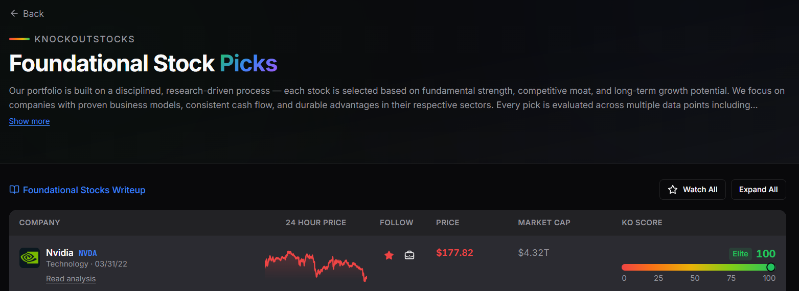 KnockoutStocks presents a focused, high-conviction investment portfolio assembled by its internal research specialists. Each holding passes through comprehensive analysis, sector evaluation, and practical investment logic emphasizing fundamental strength, sustainable competitive positioning, and extended growth runway.